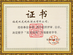 雙龍戲珠酒業(yè)作為福建省白酒研發(fā)中心,榮獲福建老字號(hào)產(chǎn)品、福建省農(nóng)業(yè)產(chǎn)業(yè)化龍頭企業(yè)、福建東南窖酒文化館、科技小巨人領(lǐng)軍企業(yè),國(guó)家守合同、重信用單位等榮譽(yù)。